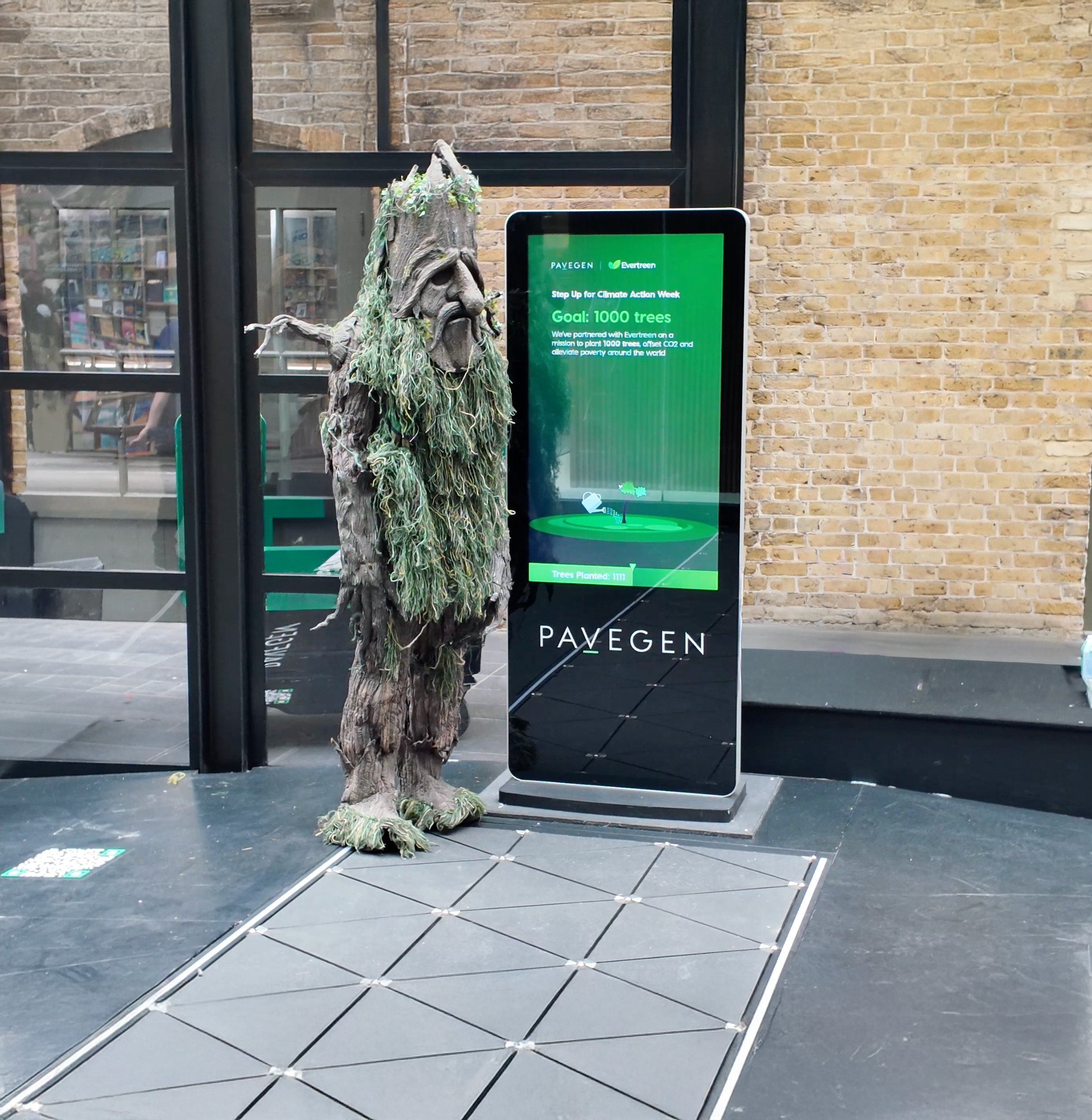 • QR Code Integration: Links to tree-planting map and information about the Pavegen crowdfund